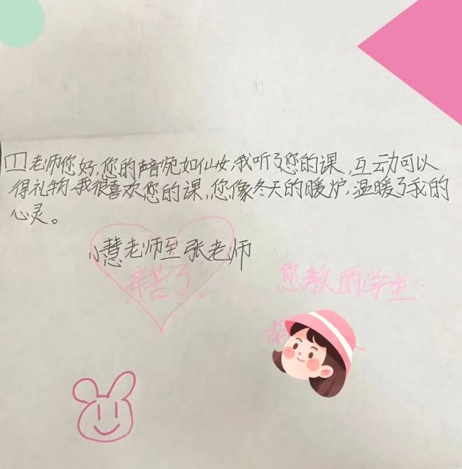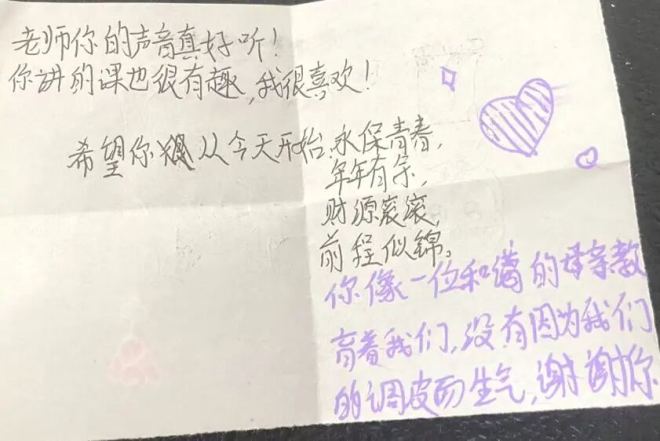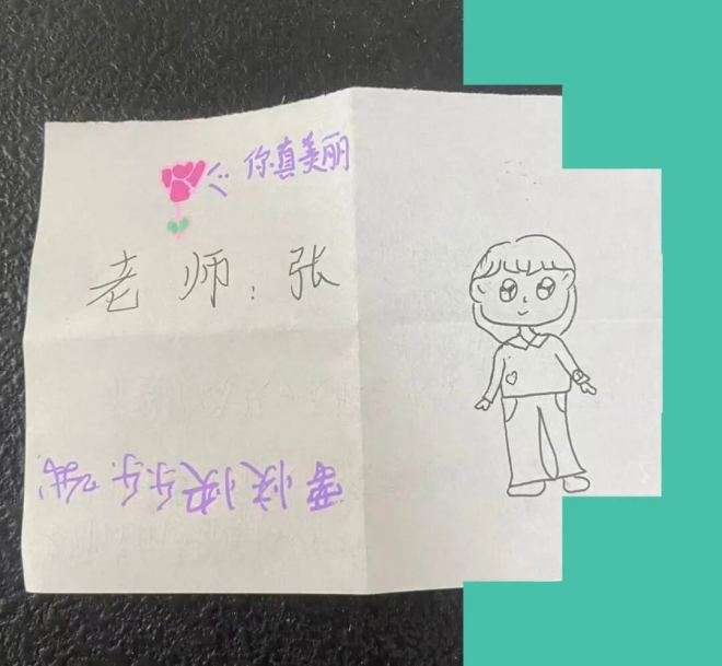 让豆子老师意外的是那些小惊喜。第二次上课前,一个扎马尾的女孩跑过来,塞给她一张折成小方块的纸条。打开一看,上面用彩笔写着:“老师谢谢你告诉我们这些。我以前很怕长大,现在不怕了。”