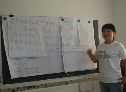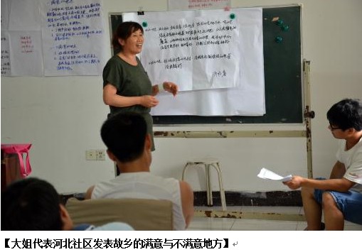 7月5日早上,协作者让小组们去院子里找寻故乡的美与不美的象征物,并让每一组出来分享,其中曹大姐,拿了一片叶子和垃圾袋,她分享道,“如果我们所有人能够用小绳子小叶片来买肉,那么我们的垃圾袋就不会这样满天飞了,如果我们每个人都减少垃圾袋的使用,就不会有这么多白色污染了”。话语的质朴,赢来了大家的掌声。还有的学员拿了一坯土和一个电池,也开始分享他们的感受。紧接着,张兰英老师抛出了“生态家园”的概念,让小组来讨论什么是生态家园,并说出家园的满意与不满意的地方,学员们非常积极的参与到讨论中,并从家、村庄、周边环境三个角度来回顾自己家乡,因为是自己熟悉的家乡,大家开始滔滔不绝地发表自己的看法。