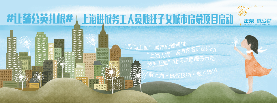 基于这样的背景,2014年9月,由正荣微公益支持的“让蒲公英扎根”进城务工人员随迁子女城市启蒙项目启动。项目将通过“我与上海”城市启蒙课堂、“上海人家”城市家庭历奇活动、“我为上海”社区志愿服务行动,为其敞开“了解上海·感受接纳·融入城市”的那扇窗。该项目由上海闵行区乐心社会工作服务中心执行,实施地为上海市闵行区浦江镇民工子弟学校,项目执行期为一年。
