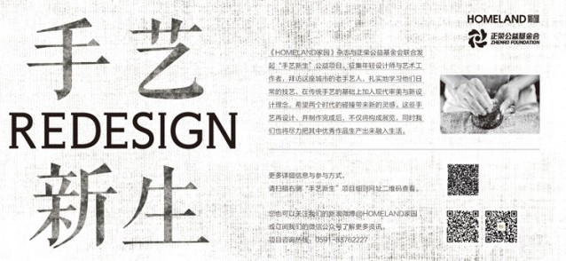 正荣公益基金会与《HOMELAND家园》杂志联合发起的“手艺新生”公益项目,目前已经进入招募设计师阶段。“手艺新生”项目希望征集到年轻设计师与艺术工作者,拜访这座城市的老手艺人,扎实地学习他们日常的技艺,在传统手艺的基础上加入现代审美与新设计理念,希望两个时代的碰撞带来新的灵感。这些手艺再设计、并制作完成后,不仅将构成展览,同时我们也将尽力把其中优秀作品生产出来融入生活。
