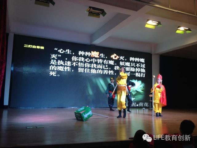 舞台上,小孙悟空抓耳挠腮,不耐烦的听着小唐僧关于心与魔的教诲,时光交错,五百年后,至尊宝上演了一段与紫霞仙子的爱恨情仇,并最终参悟到“自爱”、“大爱”和“觉有情”这爱的三重境界。这是四年级一班学生在共读《西游记》后,在学期末童话剧中的表演,每个孩子都有个角色,其中腿部残疾的小姑娘担任旁白,而班主任丁老师是编剧。全校近四百小观众,有些孩子就趴在舞台边,时而捧腹大笑,时而若有所思。亦等着自己班级的表演。