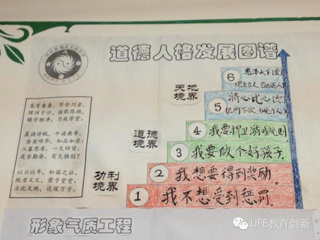 那具体来说,什么是高度?什么是创造?每个班级墙上贴着的“幸福需要层次”和“道德图谱”又给了孩子进一步的指引。分析小说中人物性格的时候,同学间发生摩擦的时候,共同讨论事务的时候,寻找让自己有成就感的事情(或活动)的时候,老师都会用这两个图谱和孩子们一起探讨。所以当你在和学生聊天的时候,当你在看学生作文的时候,你看到他们常常提到的词汇:喜欢、成就感、尊重、关怀、惠泽天下。。。那便不足为奇了。